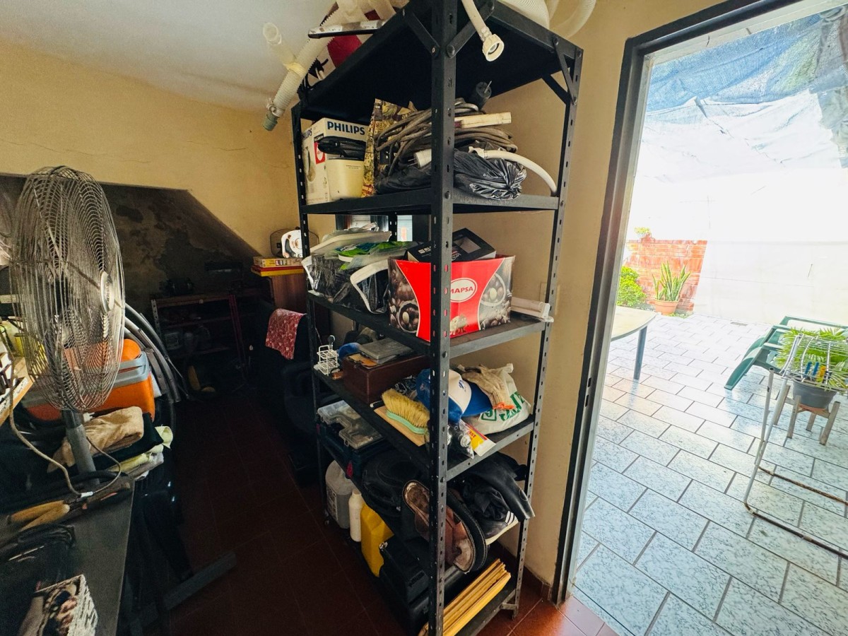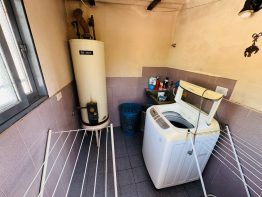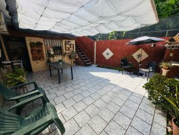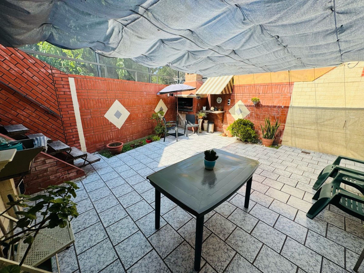 Patio seco atrás de la casa principal con parrillero y acceso a terraza con lavadero.