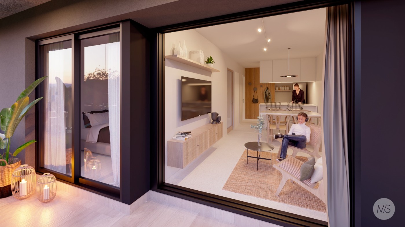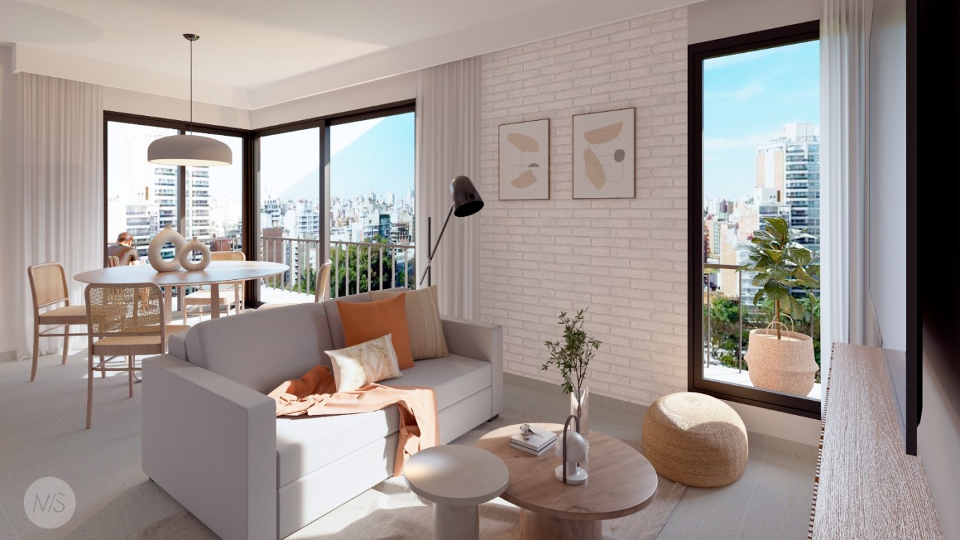 Depto de 1 dormitorio. Ingreso a cocina, integrada a estar comedor con salida a balcón; en íntimo dormitorio, baño completo y lavadero.