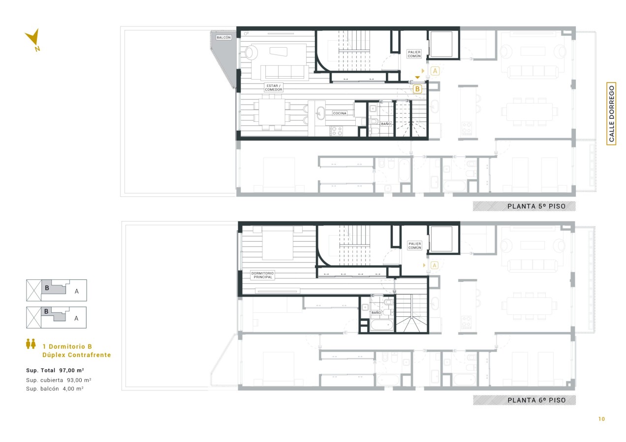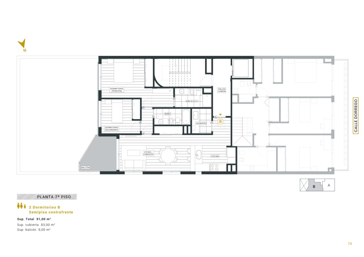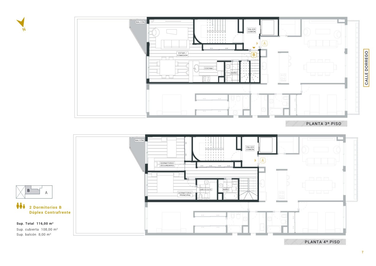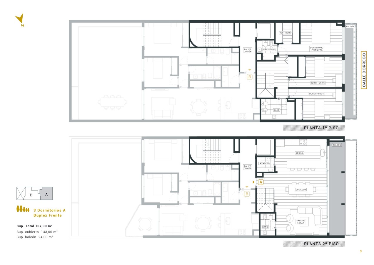 Se desarrollan tipologías de departamentos de 2 y 3 dormitorios; 1 y 2 dormitorios en dúplex; 3 dormitorios dúplex y tríplex. En el último piso se encuentra la azotea de uso común y de uso exclusivo de una de las unidades.