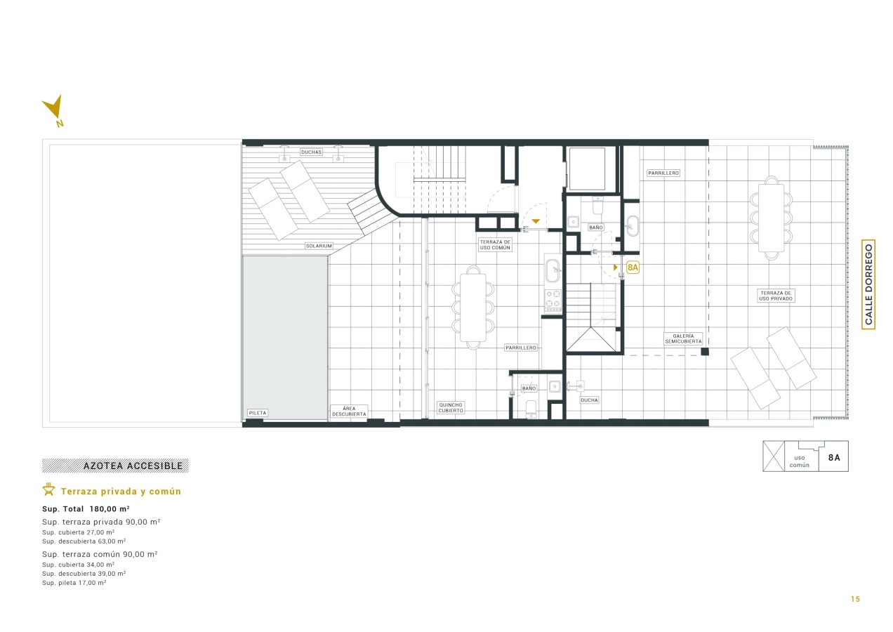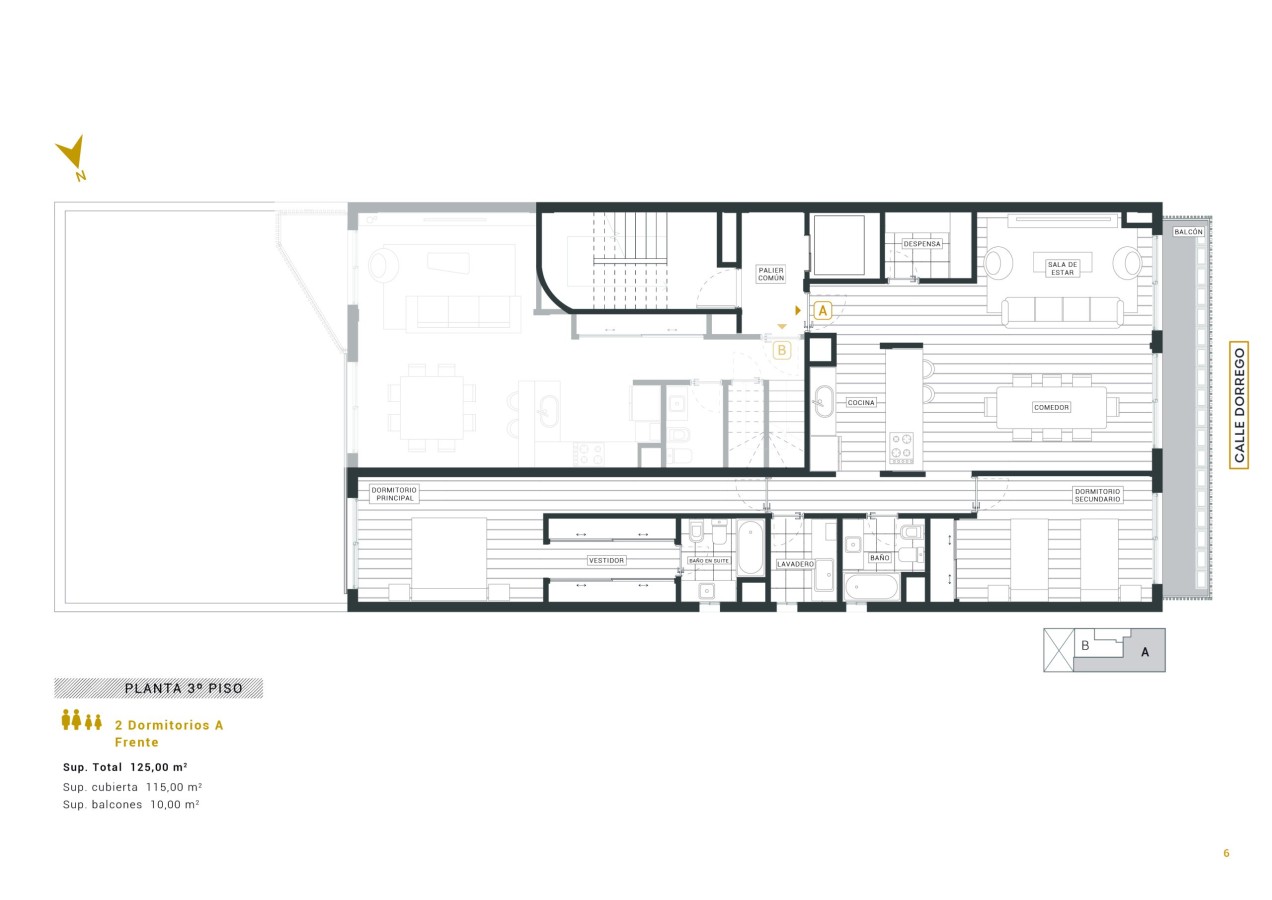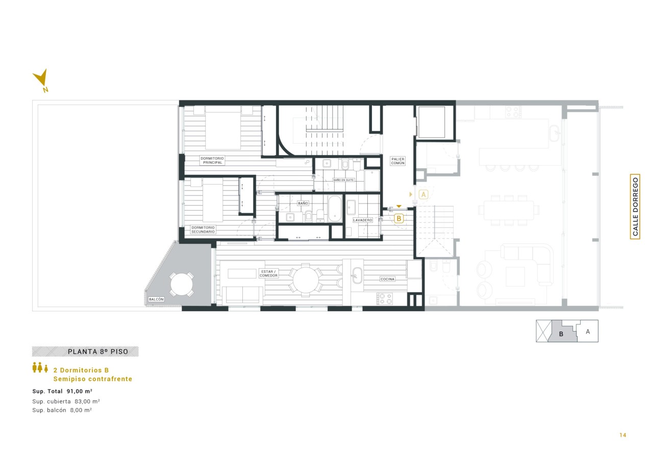 Se desarrollan tipologías de departamentos de 2 y 3 dormitorios; 1 y 2 dormitorios en dúplex; 3 dormitorios dúplex y tríplex. En el último piso se encuentra la azotea de uso común y de uso exclusivo de una de las unidades.