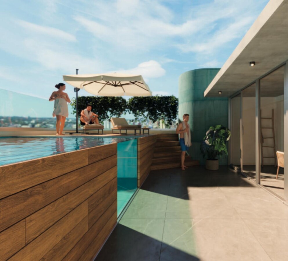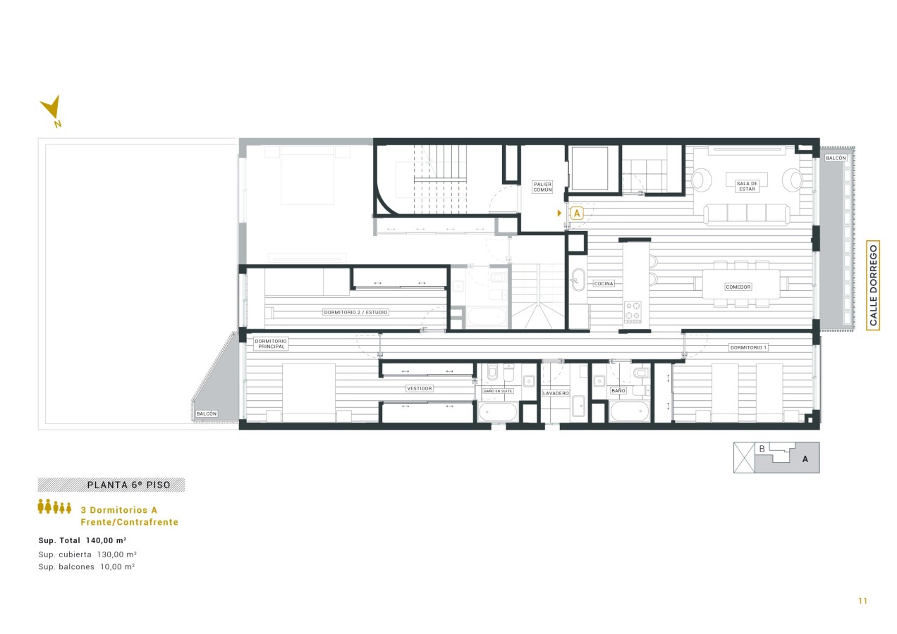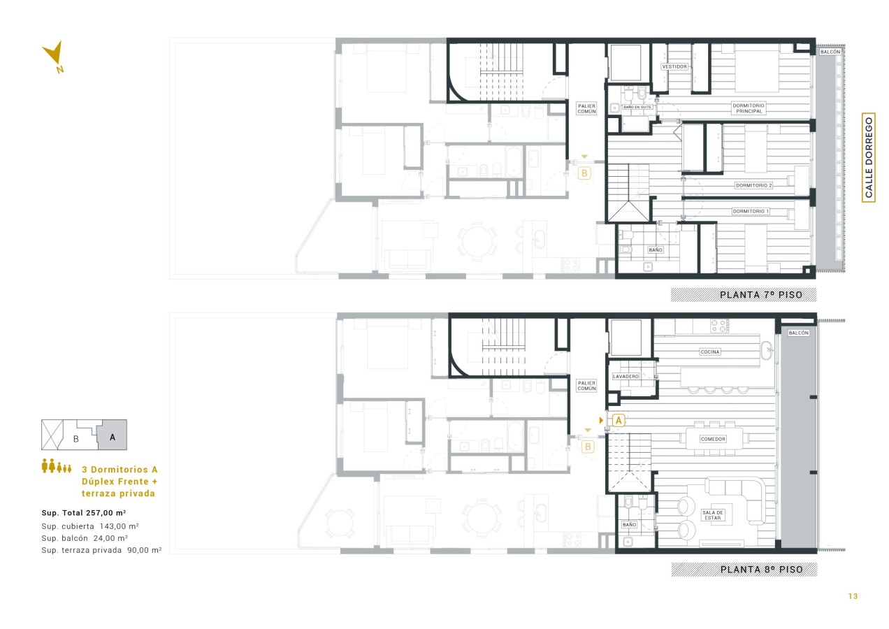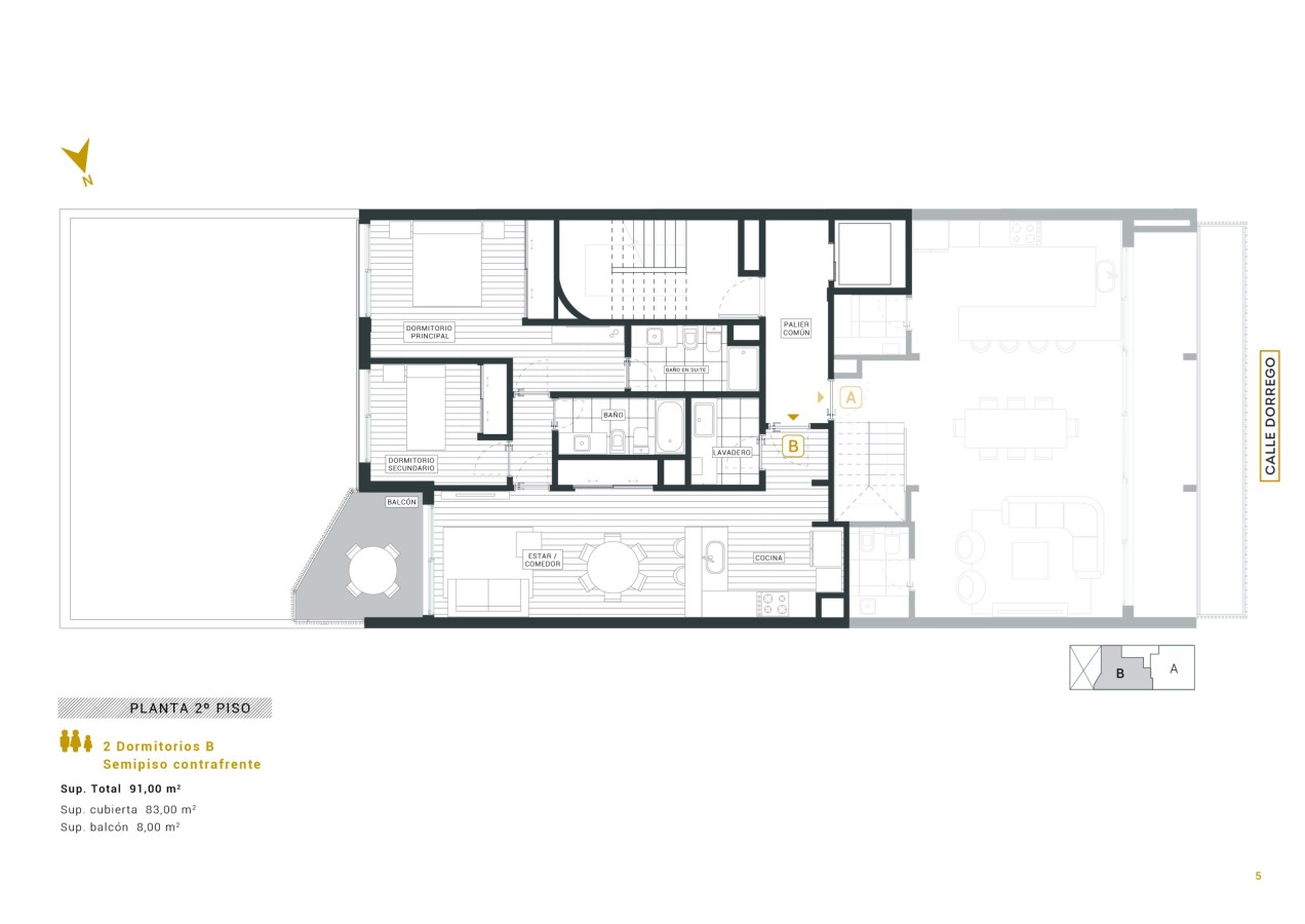 Se desarrollan tipologías de departamentos de 2 y 3 dormitorios; 1 y 2 dormitorios en dúplex; 3 dormitorios dúplex y tríplex. En el último piso se encuentra la azotea de uso común y de uso exclusivo de una de las unidades.