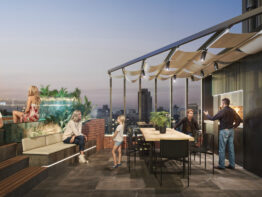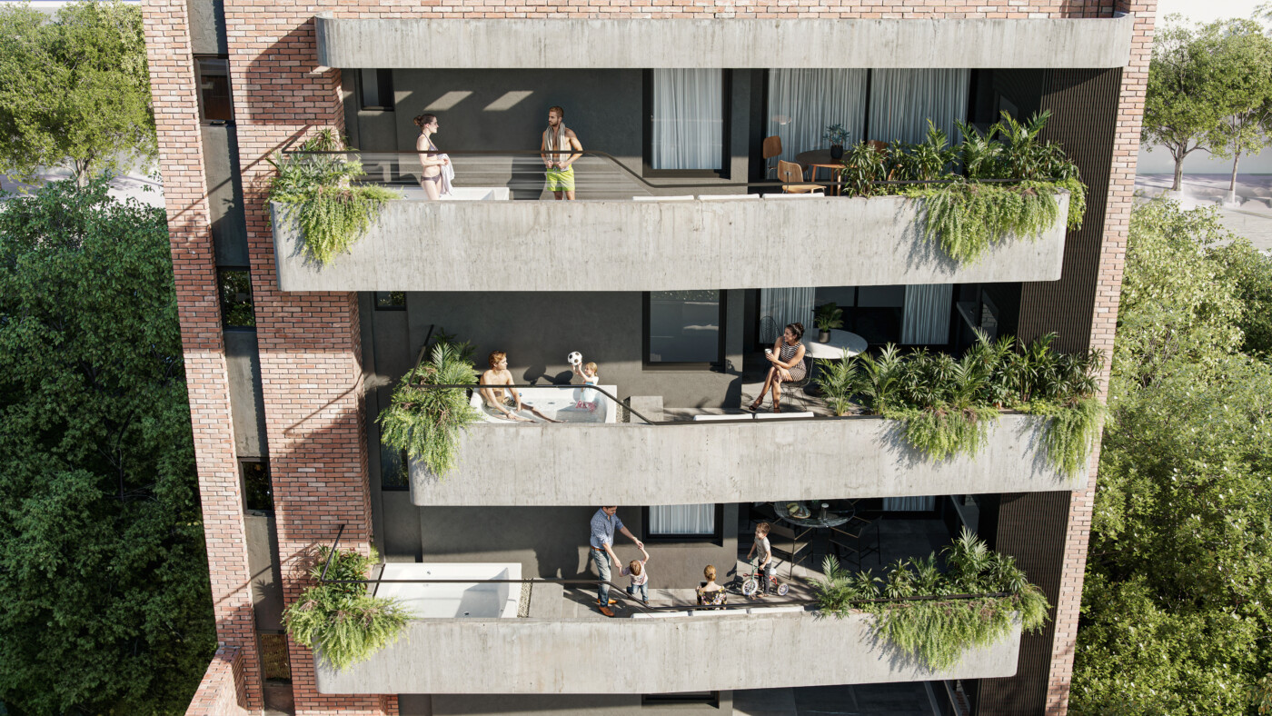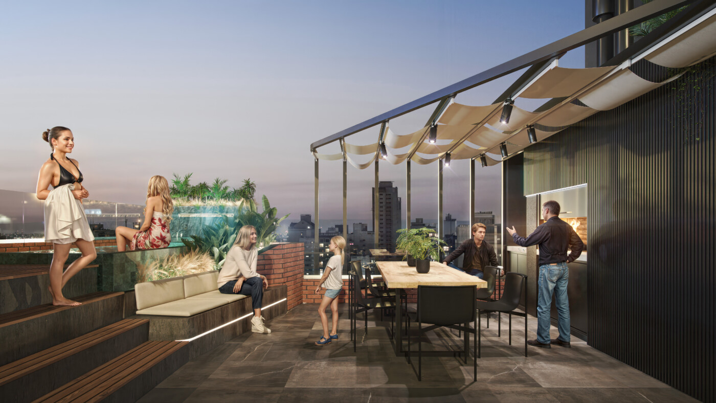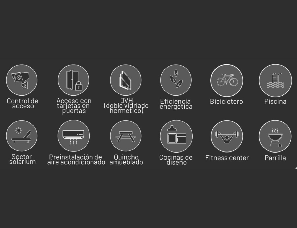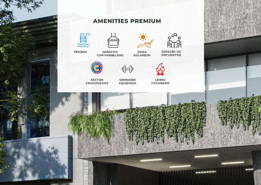 El edificio contará con departamentos de 1, 2 y 3 dormitorios. Variedad de servicios exclusivos como gimnasio, amenities premium, sector Crucijuegos, bicileteros, cocheras, bauleras, entre otros.