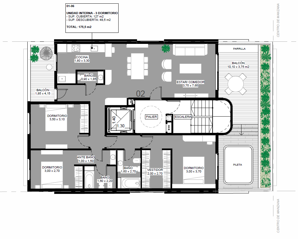 Departamento de tres dormitorios. Consta de ingreso a amplio estar comedor, con salida a amplio balcón con parrillero y pileta.