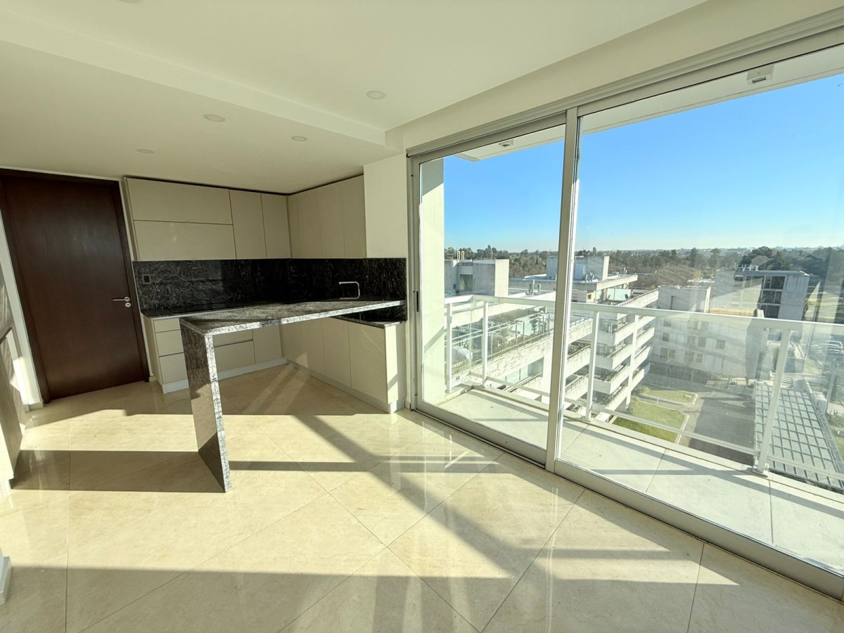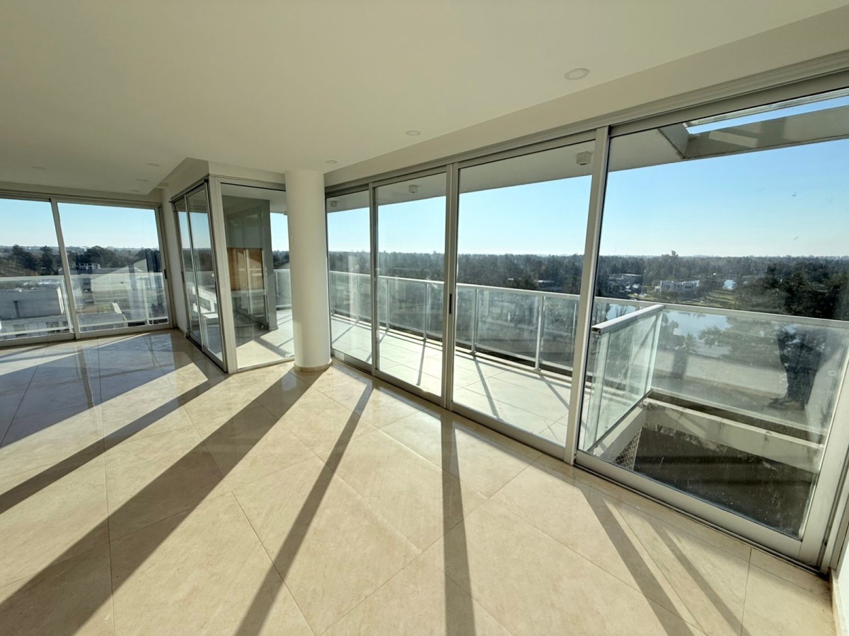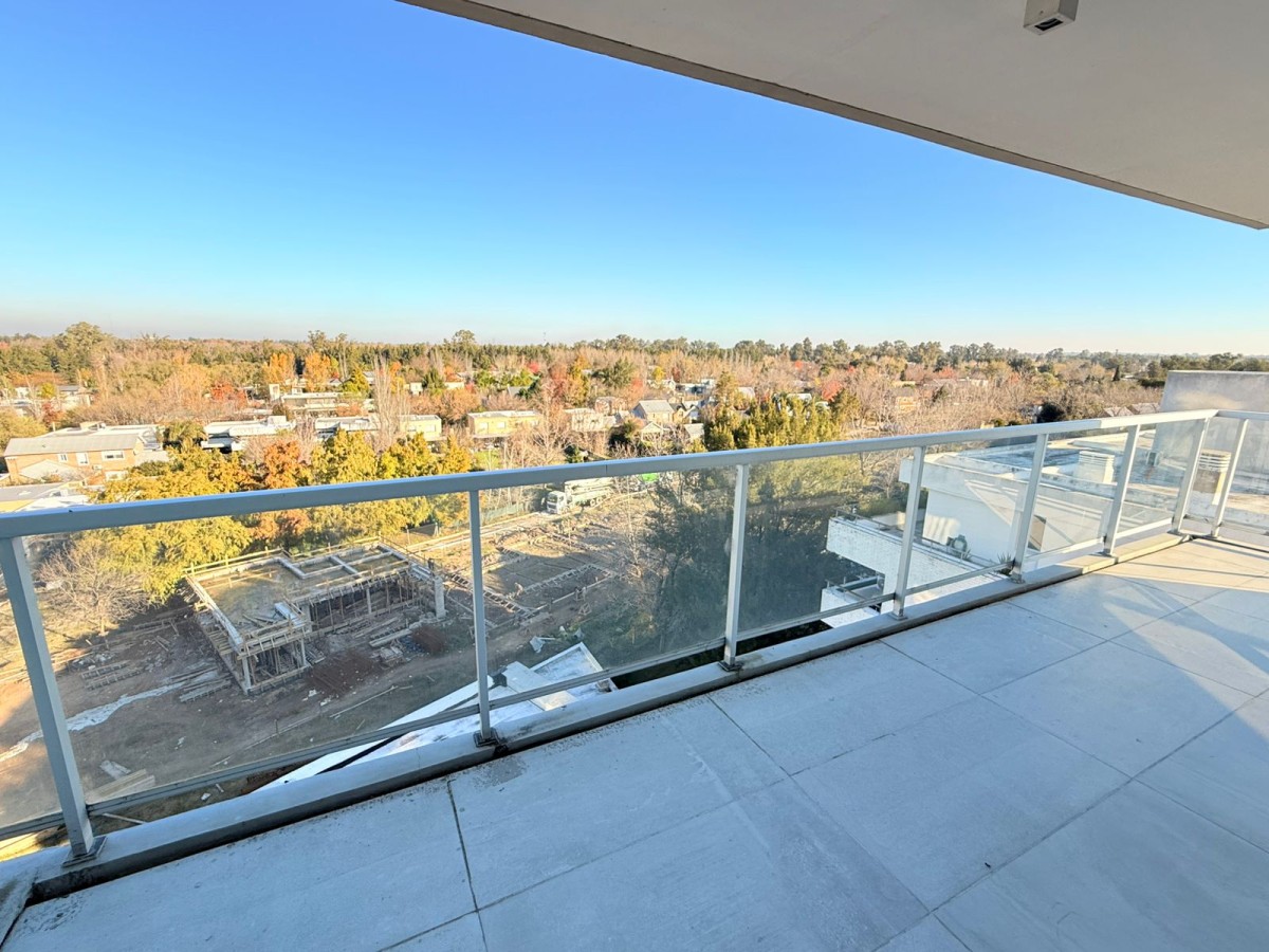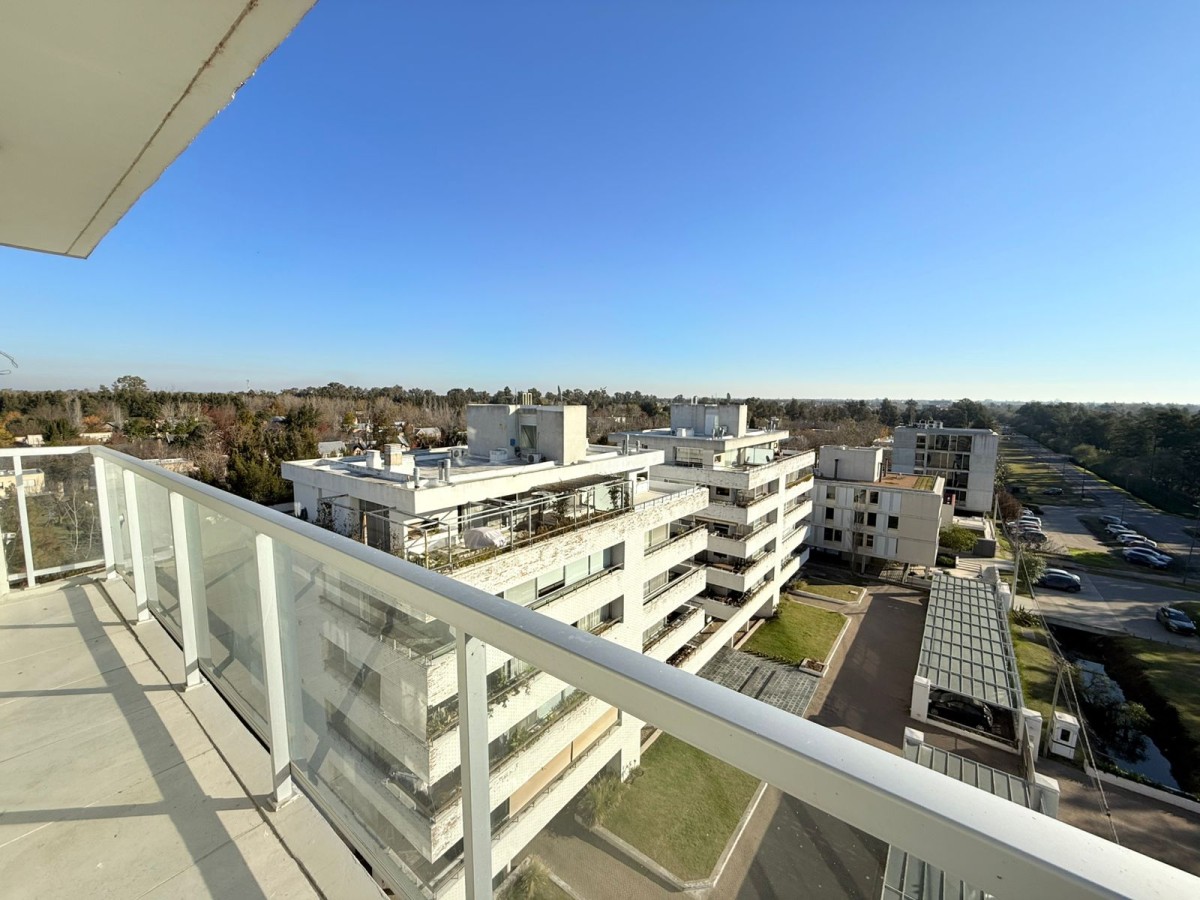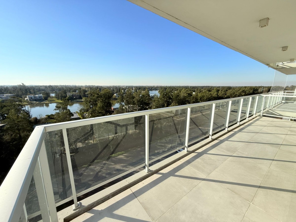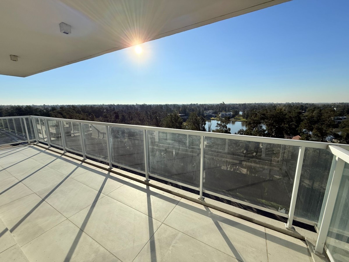 Semipiso con vista panoramica al country del lago y al barrio de Aldea Fisherton con balcón aterrazado con parrillero individual.
