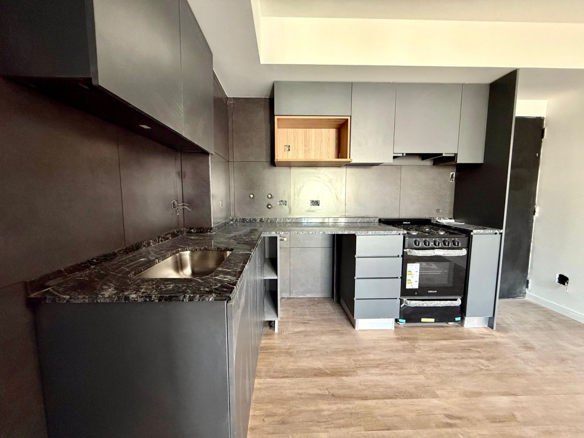 Muebles de cocina completos (bajo mesada, alacenas, porta microondas) en melanina. Mesada en granito, pileta de acero inoxidable y grifería monocomando FV.